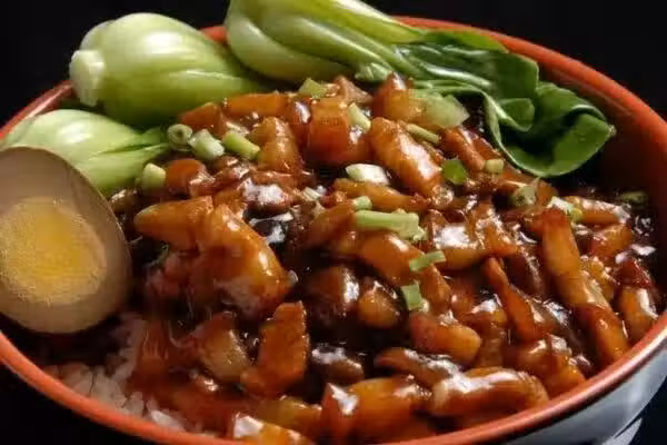 10.燒開水,加點鹽和芝麻油,將油菜和胡蘿蔔片燙熟,跟滷肉、雞蛋一起放在米飯上拌勻食用