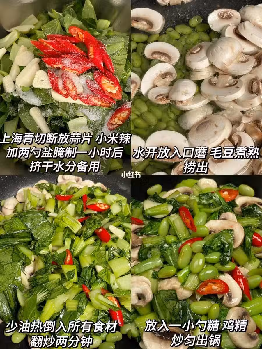 做法步驟也非常簡單,首先將油菜洗凈切成長度適中的段,毛豆去掉豆莢,口蘑切片,蒜小米辣切成碎末。然後將油菜焯水後撈出瀝干,毛豆也焯水煮熟;接著在炒鍋中加入適量油,爆香蒜小米辣,再下入毛豆、口蘑和油菜翻炒幾下,加入適量鹽和醬油調味,出鍋前滴幾滴香醋增鮮,一道美味的上海手捏菜就做好了。