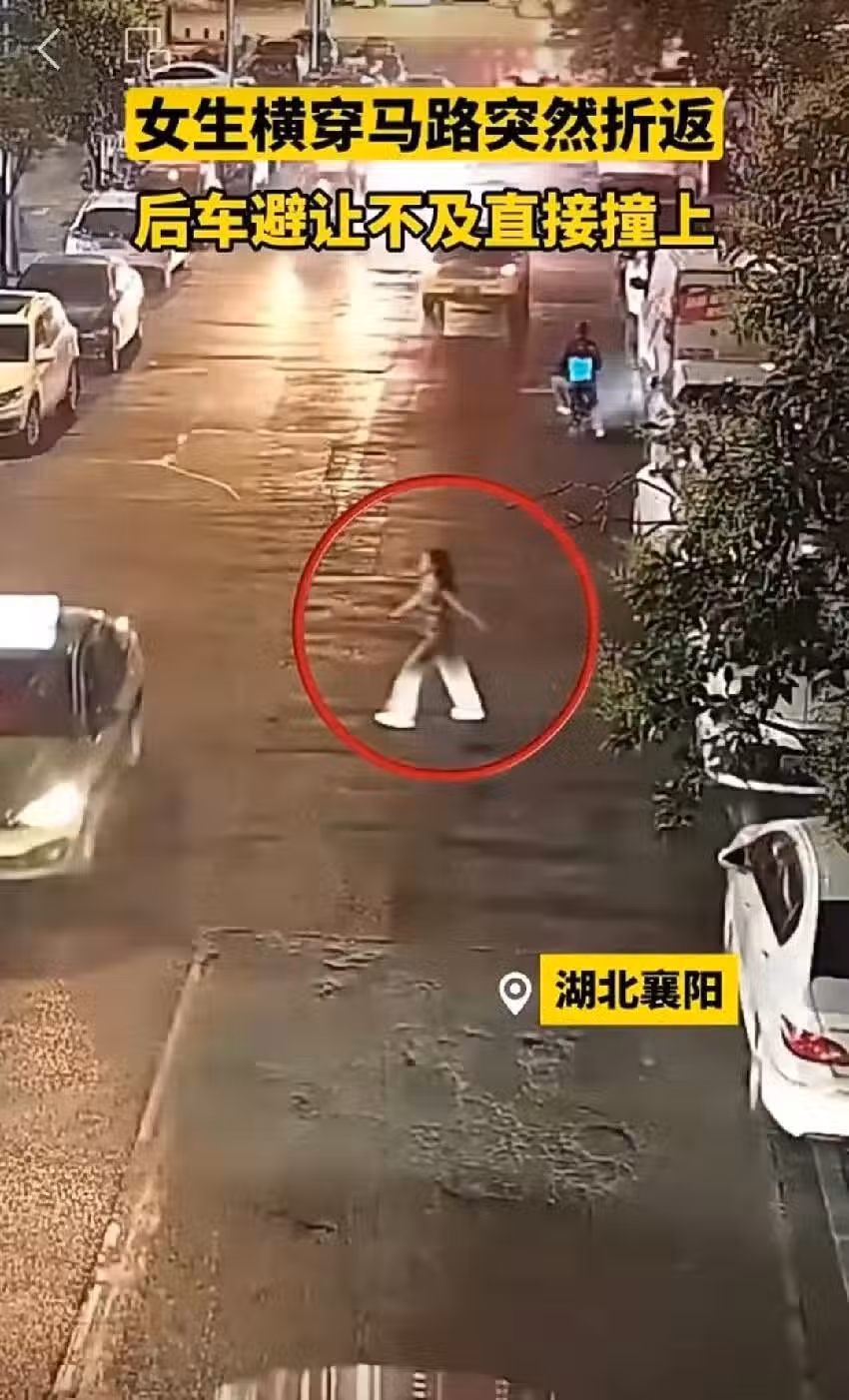 湖北一女子在橫穿馬路時突然折返,下一瞬間,直接和後車發生碰撞!