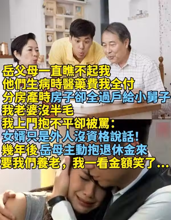 岳父母一直瞧不起我...他們生病時醫藥費我全付! 分房產時「房子卻全過戶給小舅子」我老婆沒半毛...我上門抱不平卻被罵:「女婿只是外人沒資格說話!」幾年後「岳母主動抱退休金來」要我們養老,我一看金額笑了...