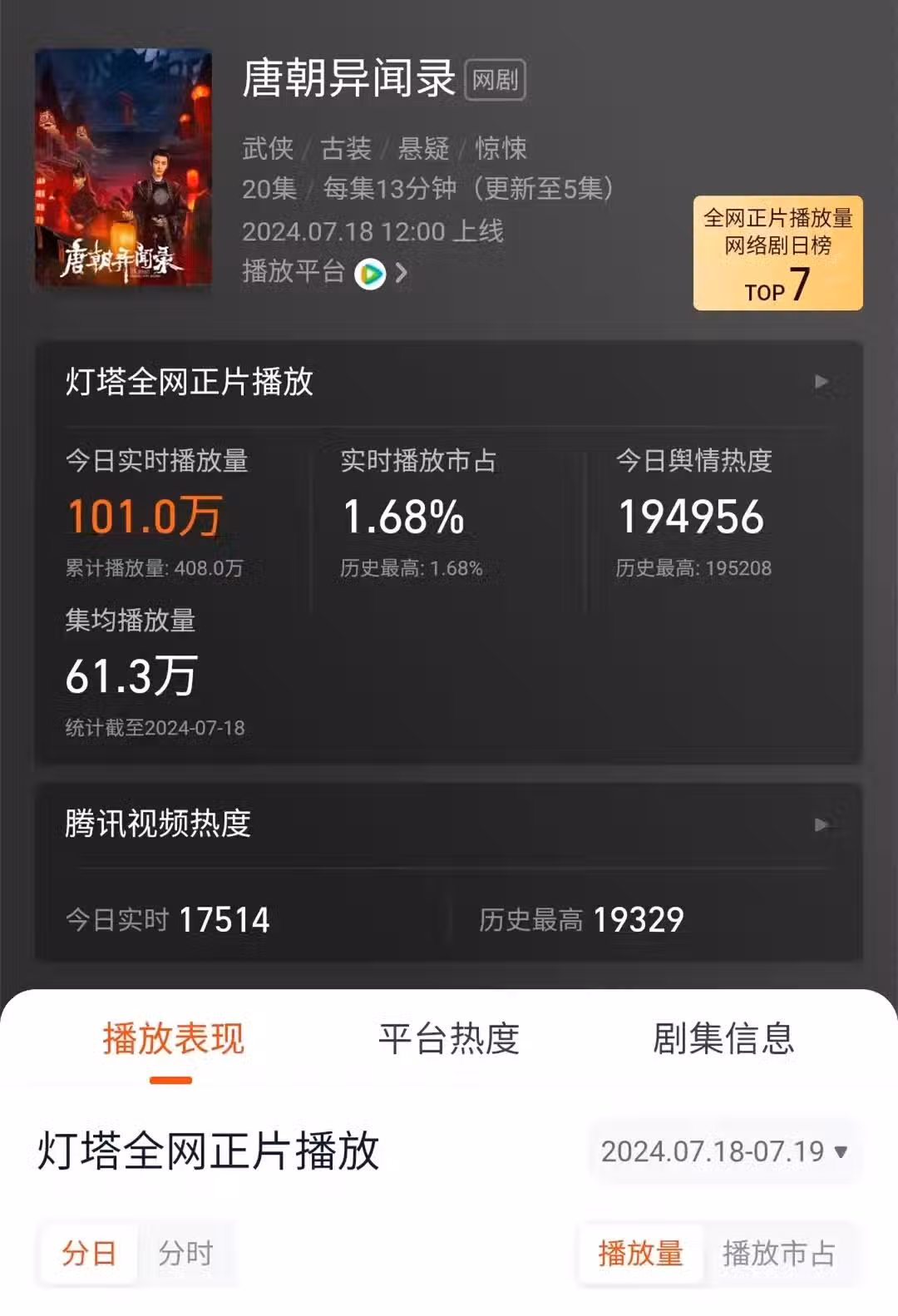 7月18日,微短劇《唐朝異聞錄》在騰訊視頻5集上線,正式首播。同時,電視劇《唐朝詭事錄之西行》在愛奇藝6集上線,正式首播。兩部電視劇作品因為名字相似,被觀眾們親切地稱呼為:截胡和蹭熱度。截胡也罷,蹭熱度也好,兩部電視劇同日上線了,那這兩部戲,哪一部播出數字更好呢?