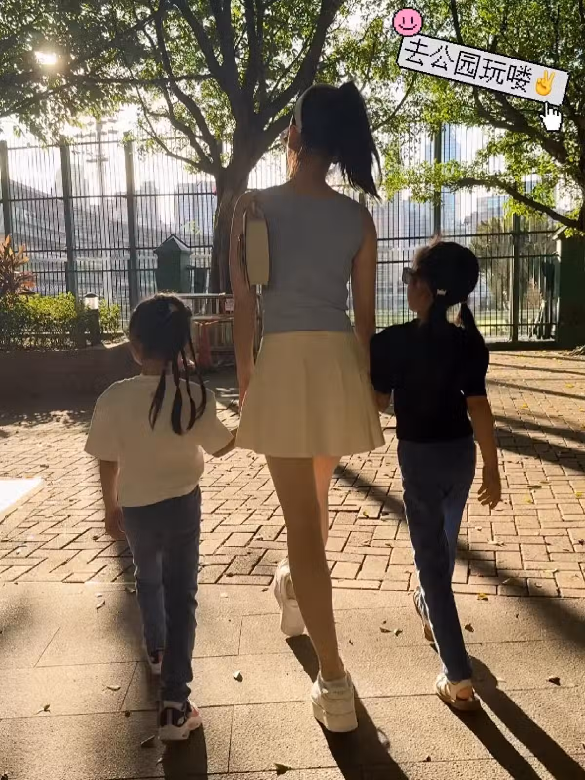 方媛扎著馬尾,頭戴白色髮帶,身穿藍色背心搭配白色短裙,一身運動風打扮少女感十足,完全看不出是37歲,而且是兩個孩子的媽媽,青春洋溢超顯年輕活力。大女兒扎著雙馬尾,身穿黑色t恤和牛仔褲,打扮甜美。小女兒身穿白色t恤和牛仔褲,面帶甜笑對鏡比剪刀手好可愛。