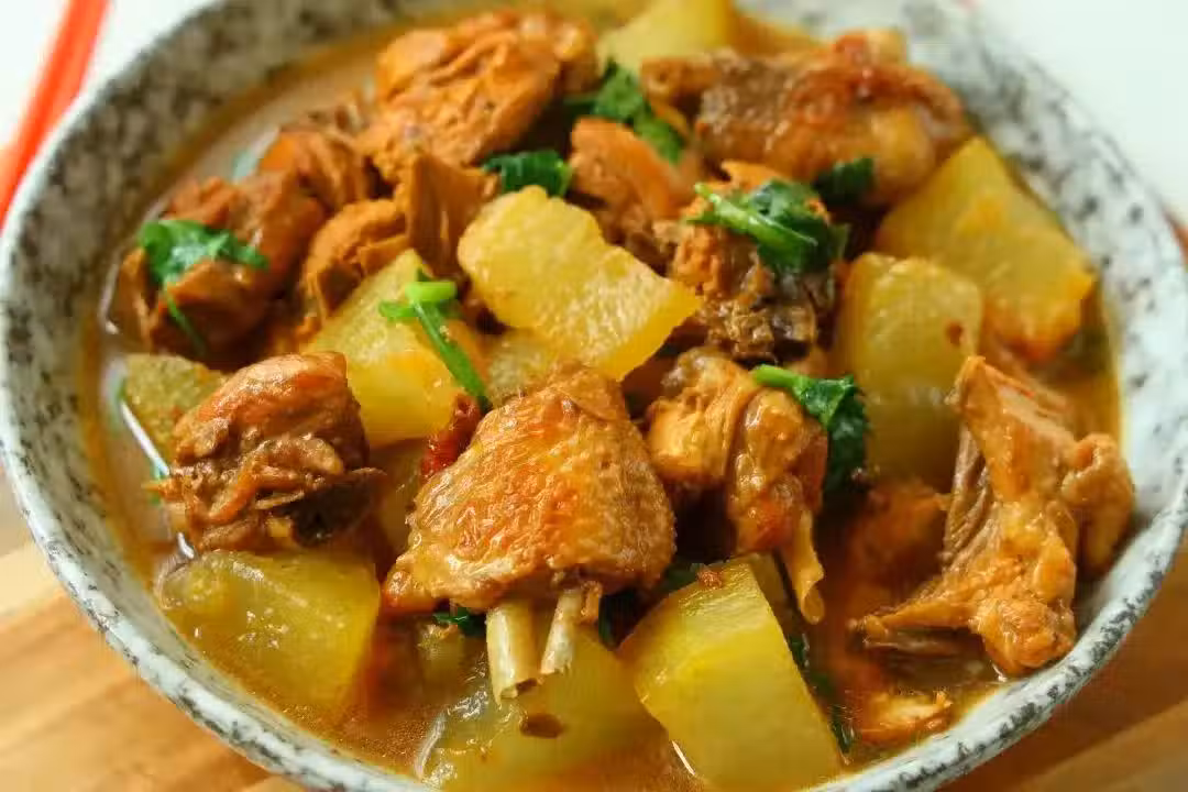 製作配料:公雞肉半隻 冬瓜1塊 生抽2勺 老抽2勺 鹽1勺 冰糖1小把 花椒八角少量 白鬍椒粉+姜粉1小勺