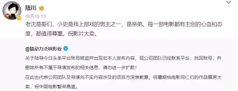 然後,陸川導演否認炮轟《抓娃娃》,坦言老沈是哥們,小史史我上部戲的男主之一,是親弟。每一部電影都有主創的心血和態度,都值得尊重,祝影片大賣!導致很多網友都罵他虛偽,敢做不敢當!