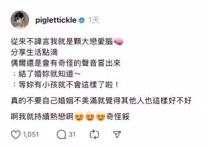 藝人敖犬於2022年認愛正妹空姐「發發」後,在去年求婚成功,交往兩年來兩人感情始終甜蜜穩定,時常在社群平台上高調放閃。21日,發發在社群平台上表示偶爾竟會收到:「結了婚你就知道」、「你有小孩就不會這樣了啦!」等留言,讓她忍不住反嗆,也十分不解對方何出此言。 時常在社群平台上分享與男友敖犬的甜蜜日常的發發,昨日在Threads發文稱偶爾會收到「結了婚你就知道」、「等你有小孩就不會這樣了啦!」等內容,忍無可忍的她直接憤怒開嗆:「真的不要自己婚姻不美滿就覺得其他人也這樣好不好!」也強調自己與敖犬持續熱戀中,不明白為何對方會說出這樣的話,更不諱言的坦白自己就是「大戀愛腦」。見到發發的貼文後,粉絲們也表示:「如果老公是神隊友又疼老婆小孩 必須要持續戀愛腦啊!」、「幸福就好啊酸民快退散!」
