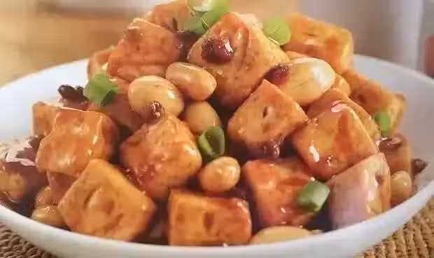☞ ④攪拌燒至粘稠狀倒入炸好的豆腐、蒜苔和紫天椒翻炒2分鐘。7)倒入花生米再翻炒均勻,撒上熟芝麻即可盛碟。