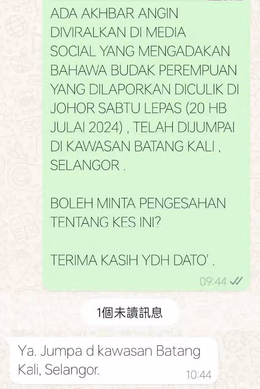 據社媒今早傳開的消息,除了透露已在峇冬加里尋獲廖家慧,也稱女童安全無恙,並已通知家屬此消息。並已通知家屬此消息。