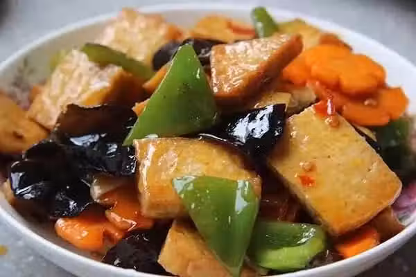 食材:老豆腐、胡蘿蔔、木耳、青辣椒、紅辣椒、姜、豆瓣醬、鹽、白糖、雞精、水澱粉