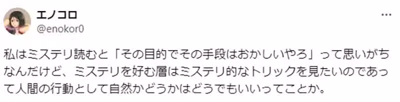 「我倒是覺得推理小說本來就有分成『謎題有趣的作品』跟『人與人的互動有趣的作品』。」