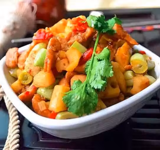 6.最後加入炒好的豬肉丁,加鹽和雞精調味即可。
