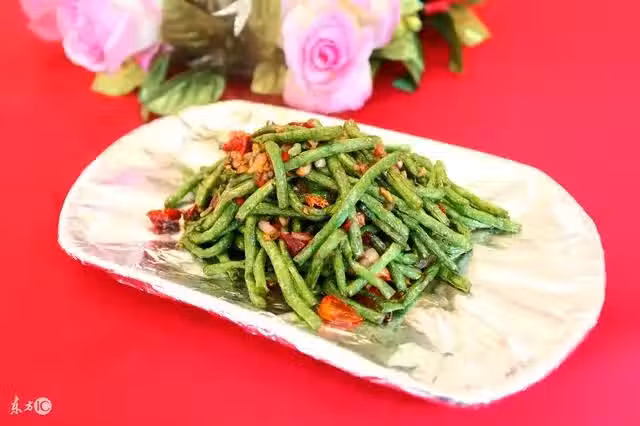 用料:扁豆400克,肉末150克 調料:干辣椒4個,老抽1大勺,榨菜末、花椒、蒜粒、鹽、味精各適量