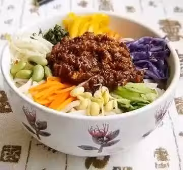 手擀麵300g、干黃醬30g、京式甜麵醬30g、五花肉丁50g、雞蛋1個、黃豆嘴50g、黃椒50g、綠豆芽50g、青豆50g、紫甘蘭50g、胡蘿蔔50g、黃瓜50g、香椿芽50g、胡蘿蔔鹹菜50g、薑末適量、澱粉適量、料酒適量、油適量、鹽適量