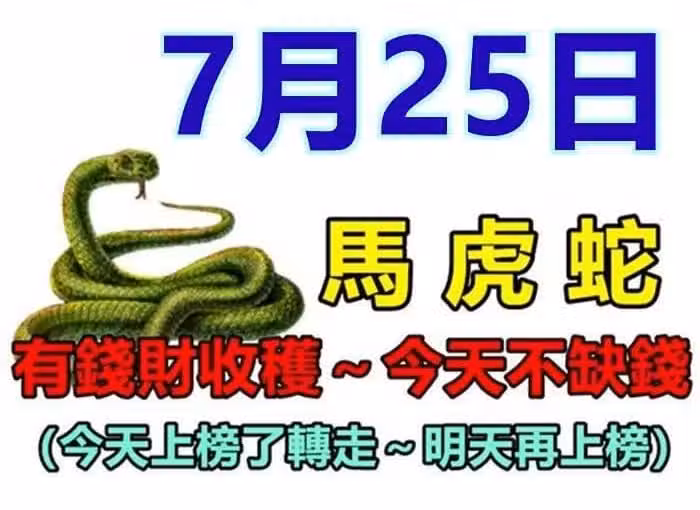 屬馬的朋友本來已經命中藏富貴, 聚八面財源 ,總會一天富貴臨門, 大富大貴。 今天7月25日生肖馬迎財接福好運兆 。 而且事業必定進入一個新的哩程碑。 從今天開始,生肖馬需準備好再衝刺,為新的月份大好基礎,且因常久以來的努力,開始逐漸達到人生的巔峰。 另外財運方面也很旺,由其偏財方面,財運可能會接二連三而來,錢財進帳,生肖馬的朋友進入7月尾端後偏財會更相當旺盛,獨占鰲頭。