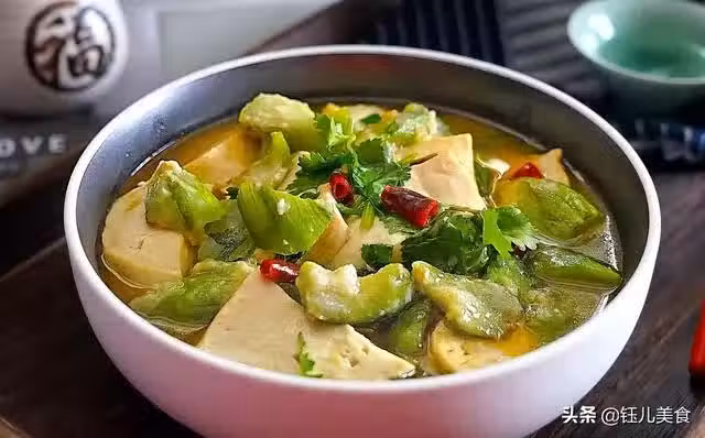 食材:絲瓜300克、豆腐300克、干辣椒3個、鹽1茶匙、雞精少許、蒜片少許、蔥1棵、香菜1棵、胡椒粉少許
