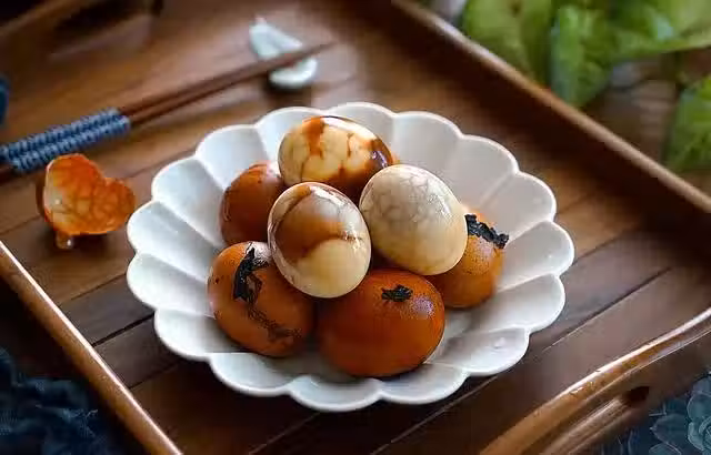 食材:雞蛋6個、紅茶15克、八角、香葉、白糖、鹽