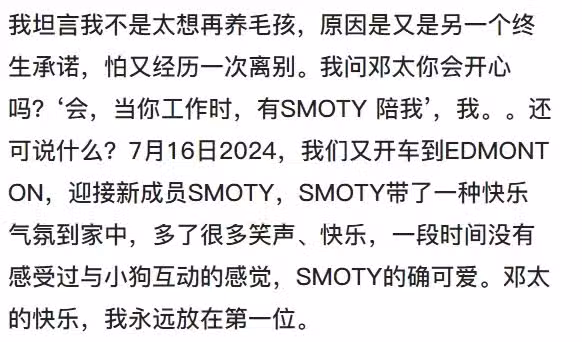 不過鄧健泓當刻沒有即時帶回SMOTY,反而與老婆商量了很多天,他坦言因為之前3條愛犬的逝去,不再想養狗,害怕又經歷一次離別,不過SMOTY能給老婆開心和陪伴,他才打定主意收養,他深情表示:「鄧太的快樂,我永遠放在第一位。」