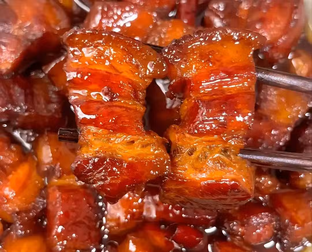 記住哦,糖色一定要用小火炒,不然很容易糊掉;當冰糖完全融化變色後,迅速倒入剛剛煸炒好的五花肉,快速翻炒均勻,讓每一塊肉都裹上糖色。