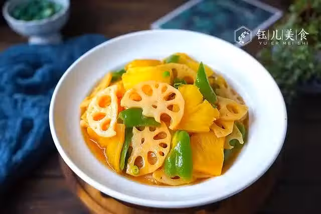 食材:蓮藕350克、菠蘿200克、青椒1個、鹽1勺、雞精少許