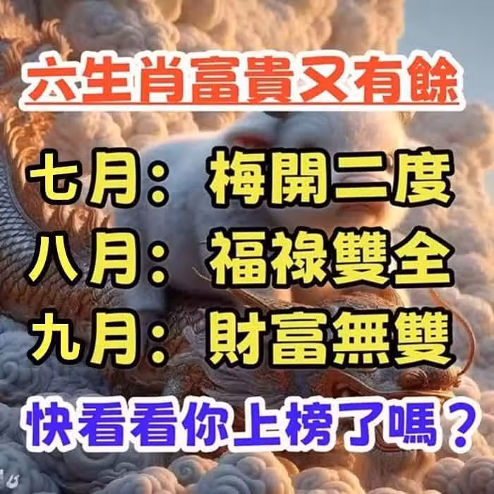 六生肖富貴又有餘,7月梅開二度,8月福祿雙全,9月財富無雙