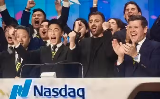在納斯達克的現場,老婆奚夢瑤一起陪著老公敲鐘,在儀式上面夫妻一起親吻,四太全家一起到現場狂歡。