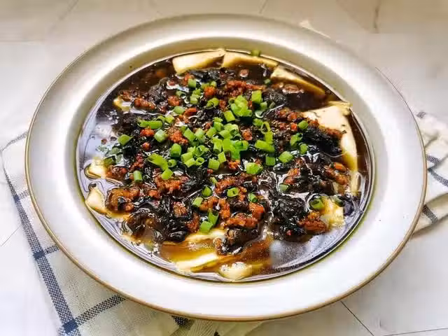5、將炒好的橄欖菜肉末鋪在豆腐上面,放入蒸鍋大火蒸15分鐘。