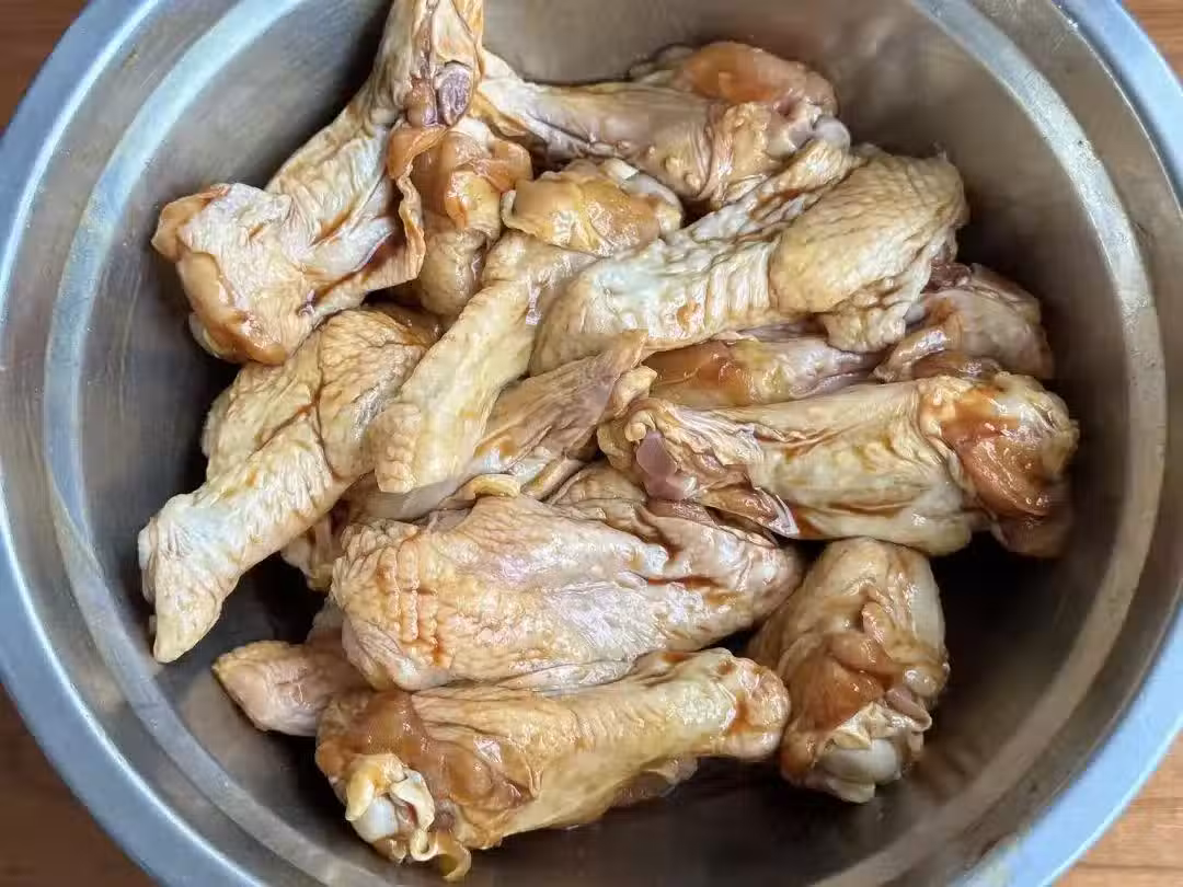 4、把腌好的雞翅根鋪在空氣炸鍋里,表面放適量的檸檬片,200度炸10分鐘。