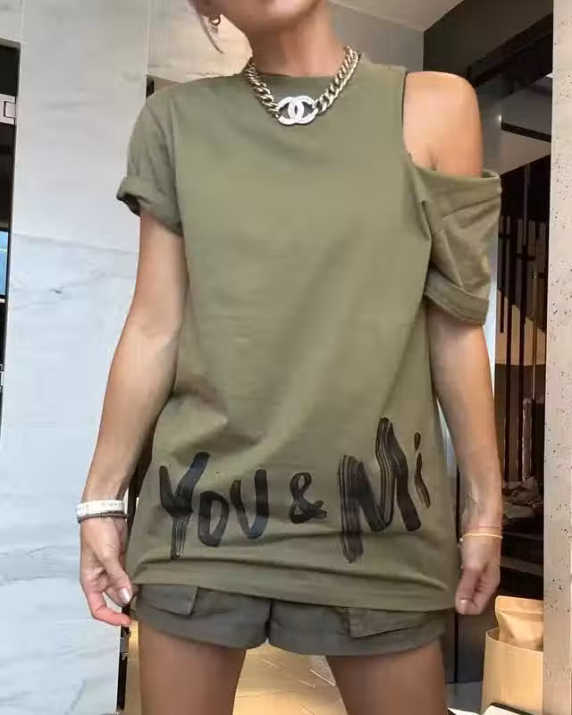 從照片可見,洗米嫂心情大靚,她身穿軍綠色的露肩衫,衫腳印有You & Mi並配上軍綠色熱褲,秀小麥色美腿,打扮年輕!