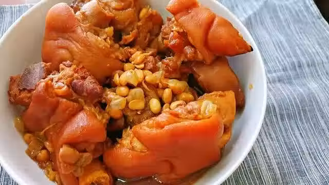 【食材】豬腳,黃豆,生抽,料酒,冰糖,鹽,蔥,姜,香葉