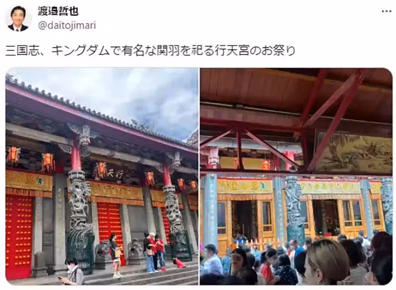 渡邊哲也透過個人的X帳號發文,分享自己前往行天宮拜拜的事情。但是他卻將行天宮主祀的關聖帝君(關羽),說成在動漫作品《王者天下》出現的人物,隨即引來大量網友的吐槽了!