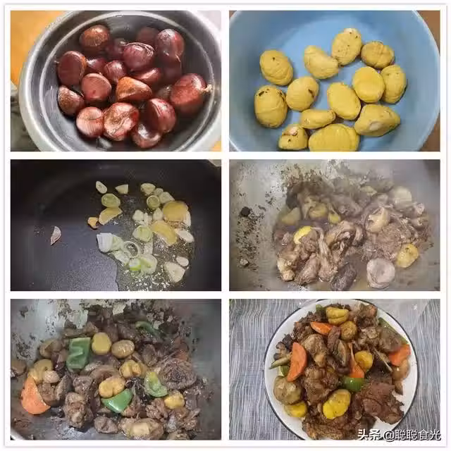 1、雞斬成雞塊備用。板栗煮好之後,去皮,再切點青椒、紅椒、蔥段、薑片和蒜片備用。