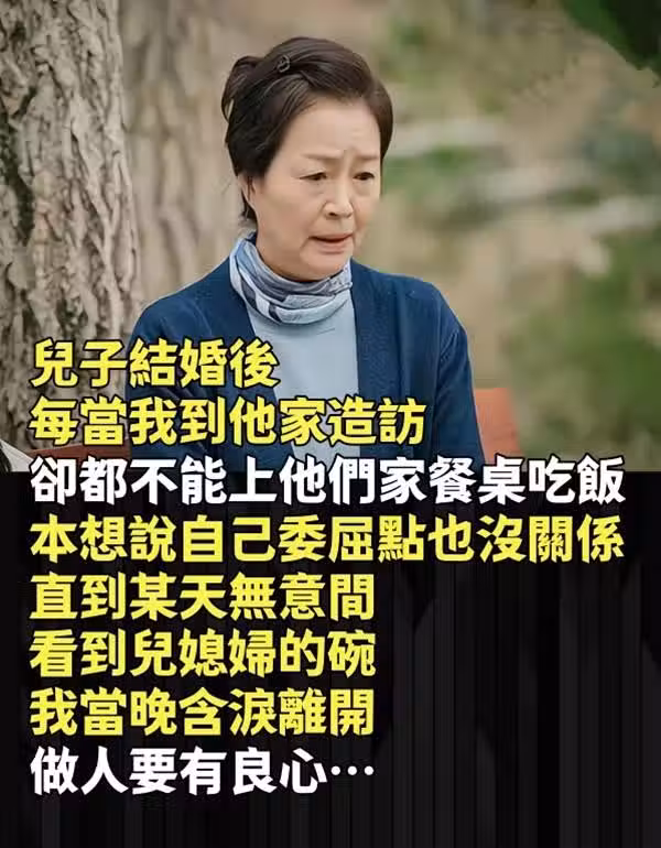 兒子結婚後,每當我到他家造訪,卻都不能上他們家餐桌吃飯,本想說自己委屈點也沒關係。直到某天無意間「看到兒媳婦的碗」,我當晚含淚離開:「做人要有良心…」