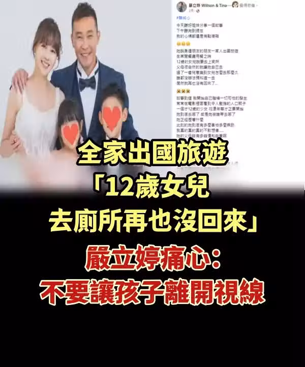 全家出國旅遊「12歲女兒去廁所再也沒回來」 嚴立婷痛心:不要讓孩子離開視線