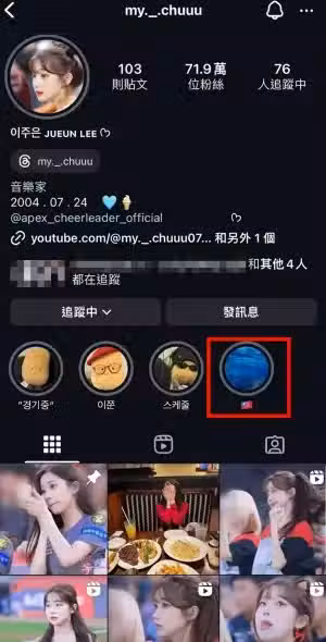 ▲李珠珢雖然人已經回到韓國,卻默默在IG帳號設了個精選限時動態,並放上台灣國旗。(圖/李珠珢IG)