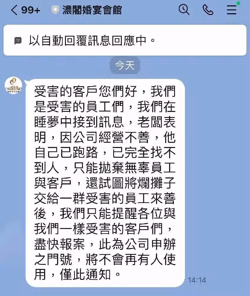 而PO文底下也釣出受害者怒喊「我們還有跟濃閣訂9月初婚宴!臨時改場地不知道去哪裡找,還要一一跟賓客交代,濃閣老闆丟下爛攤子給員工,太過分了!」,而網友們也相當傻眼,畢竟在台中濃閣維多莉亞婚宴會館算是知名度蠻高,竟然會是用這種方式宣布倒閉「請問假如是受害者,大家要如何報警處理呢?」「他粉絲團留言有受害者寫被騙錢的事了」、「5天前還有傳父親節專案」、「倒了,不少受害者」。