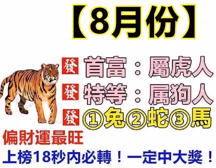 進入8月份屬虎的人的身上總是會被好運所圍繞,同時屬虎的人總是會給人帶來正能量,他們總是積極向上,充滿自信,這樣的他們總是會帶動周邊的朋友,讓他們也是充滿活力的。 好運總是會眷顧不斷努力的人,所以在8月份好運會不斷的靠近在屬虎的人的身上。