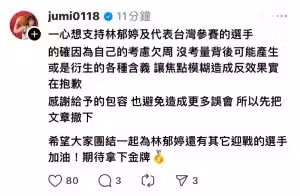 洗菜火速刪文滅火 緊急發文致歉:「考慮欠周。」後續洗菜也因為網友的批評,將該則貼文刪除,並在後續再發出一篇貼文,並附上裁判宣布林郁婷獲勝的影片,並在影片中特別點出對手Esra Yildiz Kahraman,表態:「輸整場的人。」稍早更是發文致歉:「一心想支持林郁婷及代表台灣參賽的選手,的確因為自己的考慮欠周,沒考量背後可能產生或是衍生的各種含義,讓焦點模糊造成反效果實在抱歉,感謝給予的包容,也避免造成更多誤會,所以先把文章撤下。」