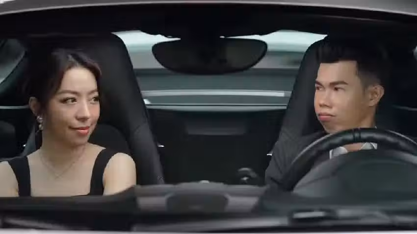 鄧佳華穿西裝開跑車與正妹約會。
