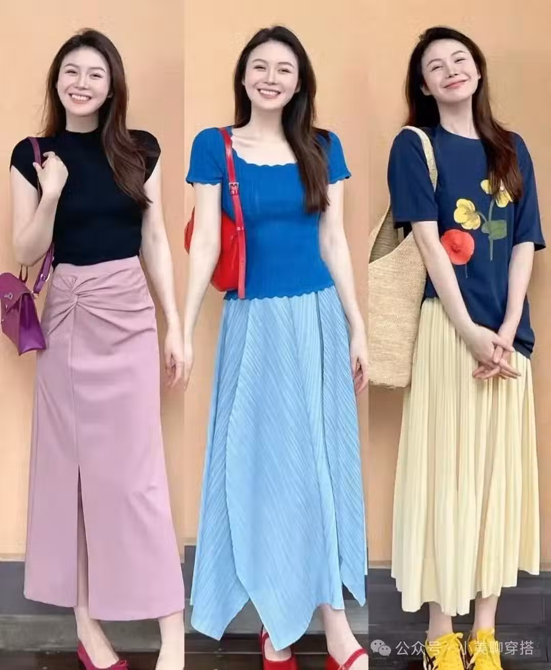 克萊因藍色的針織衫,搭配水藍色的長裙,兩種不同深淺的藍色看起來很有層次感,同時又特別清爽,顯白耐看,跟夏天很配。