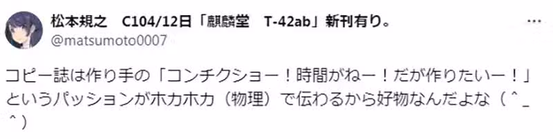 「真的,初期的Comic Market根本就像學校校慶一樣啊!!!就算只是出影印本或是護貝卡也可以啊……倒不如說在這個時代,反而可以釣到古早的宅宅呢。」