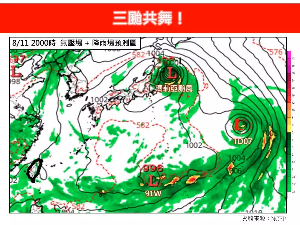 同時氣象專家林德恩在臉書《林老師氣象站》中指出,可能「三台共舞」,目前在西北太平洋海域計有3個熱帶擾動,分別為前往日本的瑪莉亞颱風、剛形成為TD07的熱帶性低氣壓,以及繼續苟延殘喘的91W。