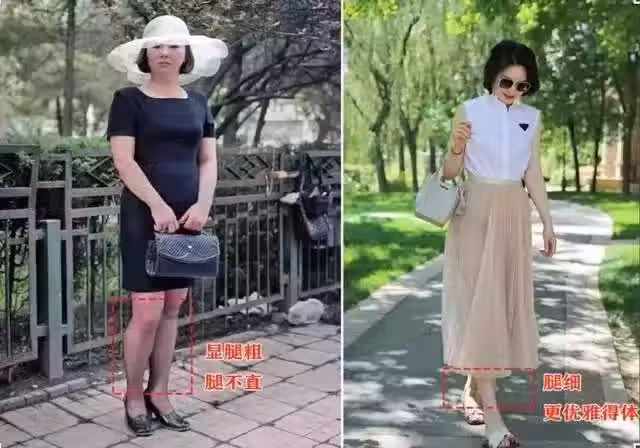 而且中年期大多都逃不了身材發福局部發胖,很難把短裙穿出優雅氣質和美感。而長裙能很好拉長腿部線條,巧妙遮住中年女性腿形不直、腿部肌肉鬆弛等問題,使整體看起來更加勻稱修長。 (2)可以根據自身腿型特點選擇長度 如果小腿稍微有點粗,建議裙長到小腿下面五公分;如果小腿腿型好看,可以選擇膝蓋下五公分即可。