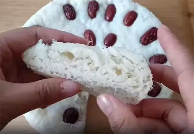 5.由於米糕中麵筋含量特別低,我們蒸出來之後,它不會像我們蒸白面發糕那樣,中間是鼓起來的,由於加入白面的原因,大家可以看到這個米糕的毛孔是非常的豐富,口感特別鬆軟,不是那種粘牙的口感。