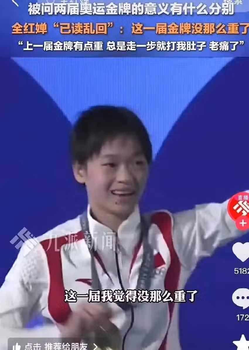 全紅嬋低頭看了眼胸前的金牌,嚴肅地說:「我覺得上一屆,上一屆,可能我有點矮吧,感覺金牌太重了,這一屆好像沒這麼重了。