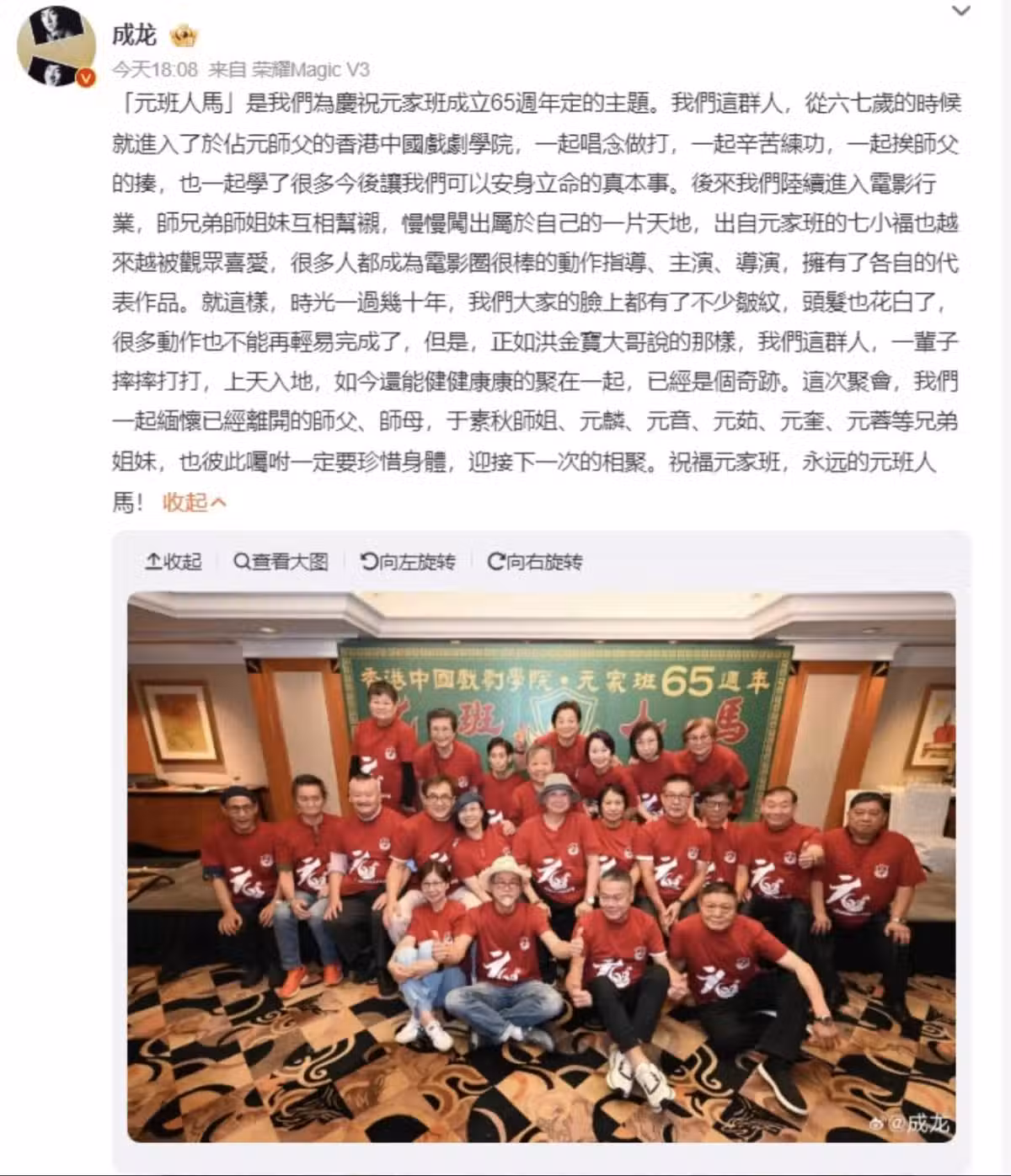 成龍在微博上發出長文,指:「一起緬懷已經離開的元奎」。(微博截圖)