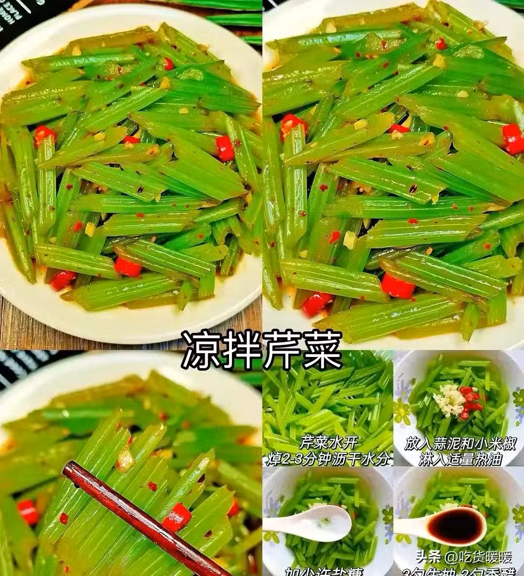 芹菜水開 放入蒜泥和小米椒 焯2-3分鐘瀝干水分 淋入適量熱油 加少許鹽糖 3勺生抽 2勺香醋 丙辣油 少許香油拌勻。
