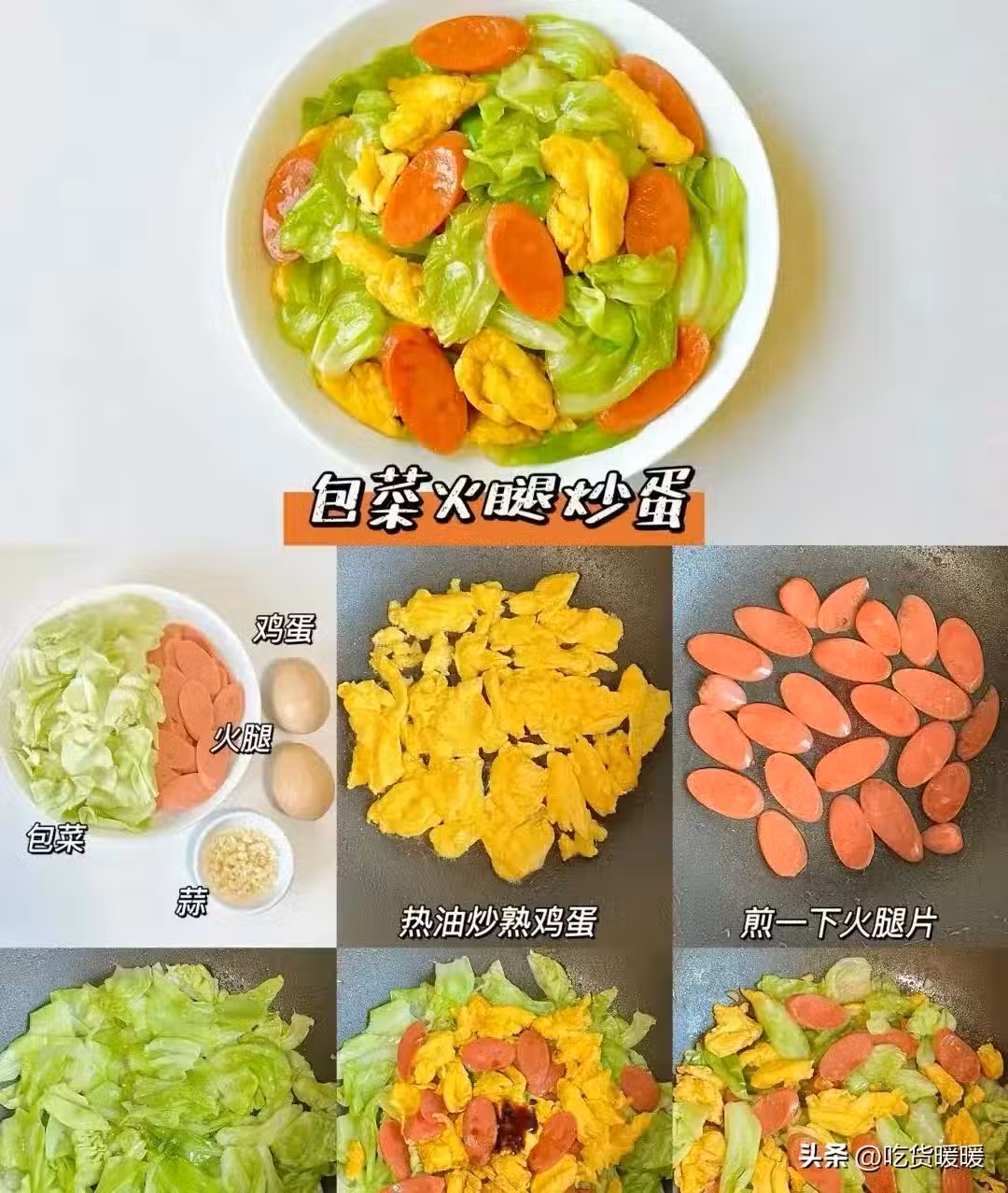 蒜 熱油炒熟雞蛋 煎一下火腿片 熱油炒香蒜末倒入包菜翻炒至斷生加入適量生抽、蚝油倒入火腿和炒蛋 翻炒均勻入味。