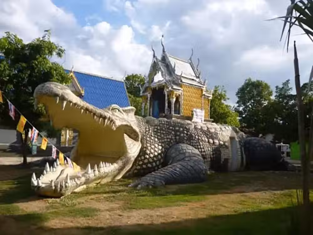 傳說中披集府有一個鱷魚王CHALAWAN,它住在一個巨大的山洞裡並對人肉很嚮往。 神話傳說就神在「腦洞大開」上——只要是進入該鱷魚王所在洞穴的鱷魚,都可以變成人形。 這鱷魚王嚮往人,不光想吃人肉還喜歡上了人類,也是絕了。 當時有兩姐妹在河邊玩耍,其中有一人被鱷魚王相中了,然後就把她綁到洞穴中。 把女孩綁回洞裡後,鱷魚王憑著洞穴的神力幻化成人形出現在女孩面前,但女孩拒絕了它的示好。 女孩的父親得知女兒被綁到鱷魚洞,悲痛欲絕並懸賞好漢幫忙解救女兒。 一個名叫KRAI THONG的男子從遙遠的省份趕來與鱷魚作戰,最終他成功殺死鱷魚王並解救了女孩,成為當地的英雄。 因為這個傳說,鱷魚在披集府依舊有很多「蹤跡」。 說不上鱷魚大府,但提起披集府你能來個「鱷魚」這個關鍵詞,就像提起清邁你脫口而出一句「薩瓦滴嬌」,當地人會對你刮目相看。 也就是從路過披集府起,我開始關注起泰國鱷魚。 不幸的是,披集府的鱷魚是被做成了巨大雕像,但泰國其他地方(特指我出現較頻繁的曼谷和清邁)的鱷魚則是被做成了串串兒。。。