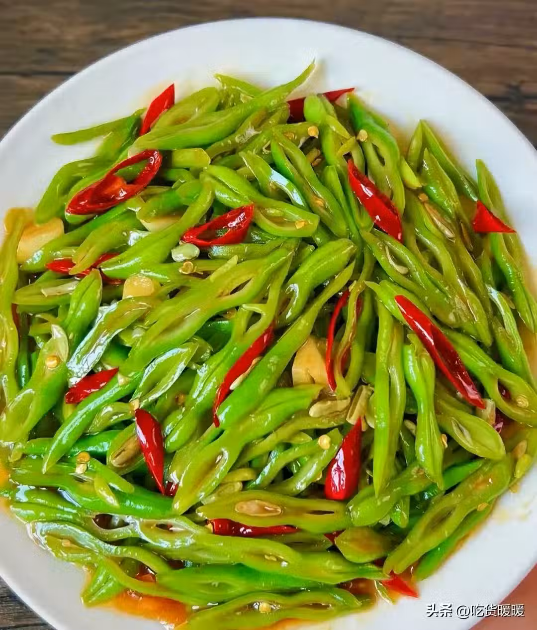 醬料: 生抽、蚝油各1勺,淋上醬汁 鹽、糖少許、半勺澱粉 半碗清水攪勻熱油爆香大蒜、干辣椒 倒四季豆炒軟 淋上醬汁 倒炒出鍋。