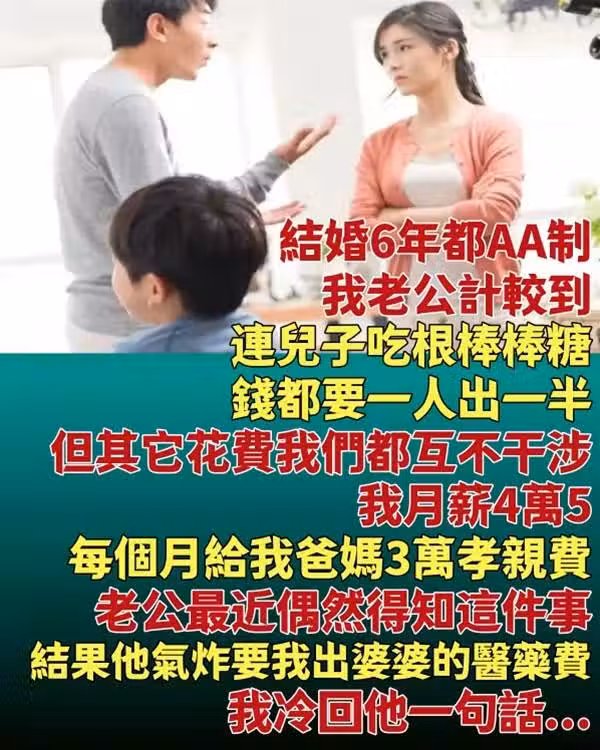 結婚6年都AA制,我老公計較到「連兒子吃根棒棒糖」錢都要一人出一半!但其它花費我們都互不干涉 ,我月薪4萬5「每個月給我爸媽3萬孝親費」,老公最近偶然得知這件事,結果他氣炸要我出婆婆的醫藥費!我冷回他一句話...
