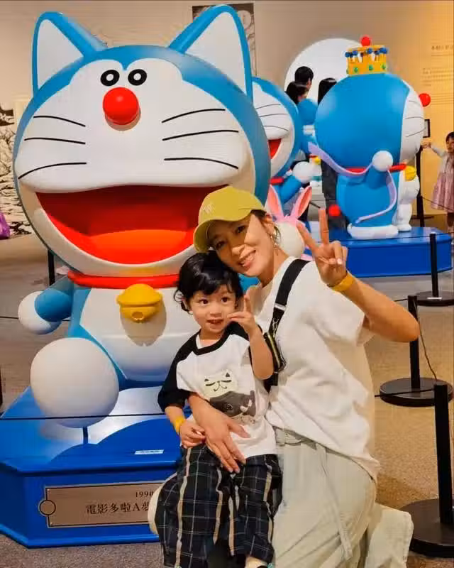 從照片可見,楊茜堯帶一對寶貝子女來到K11的《100%多啦A夢& FRIENDS》巡迴展覽,穿上碎花粉紅裙的小珍珠甜美可人。